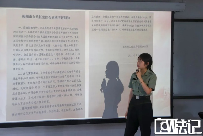 本次宣讲会上她从应征历程、军营生活、发展出路以及经验建议四个方面进行分享。她首先分享了自己应征入伍的原因以及入伍的流程。接着,她分享了自己的军营生活,包括训练的内容、话务员的主要工作、多次文艺表演的经历以及在部队的伙食等等。她还提到了在部队里的发展出路,有考军校、提干、留队或者退役。最后她给有意愿报名参军入伍的同学提出了经验建议,建议最好就争取去艰苦边远地区服役的机会。