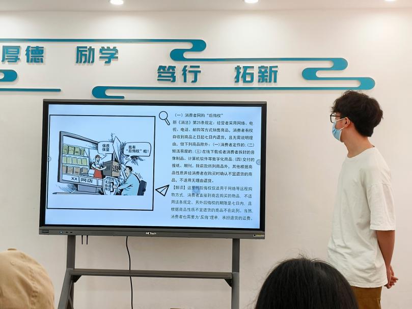 第二支部同志首先从立法过程入手,详细解读了《中华人民共和国消费者权益保护法》的制定背景、目的和重要意义,其次他从消费者网购的角度具体展示了消费者的相关权利,结合同学们日常网购经历进行解读;第五支部同志则从消费者权益保护的角度出发,阐述了消费者享有的基本权利和维权途径。通过分享真实的消费者维权案例,深入浅出地讲解,向观众展示了消费者在遇到消费纠纷时应该如何应对、如何维护自己的合法权益,同时,还强调消费者要在日常生活中保护好自己的个人信息,加强信息维护意识。