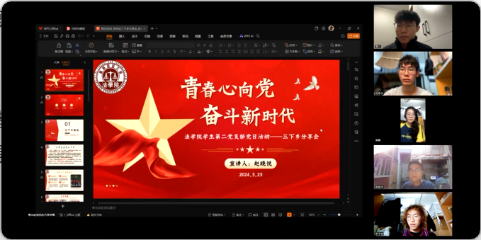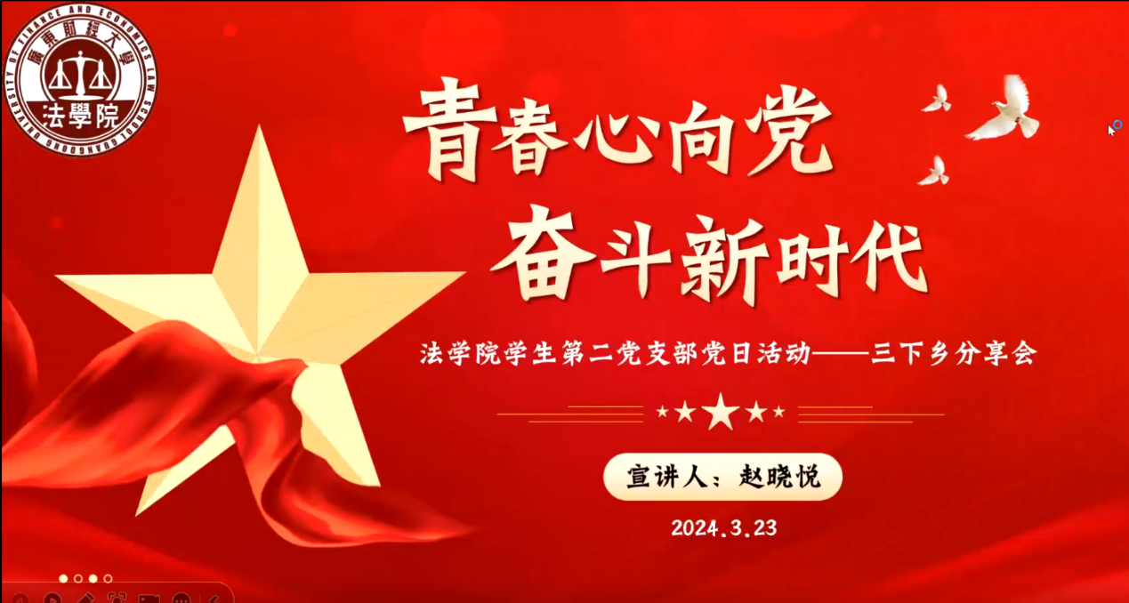 为推动学习贯彻习近平新时代中国特色社会主义思想主题教育走深走实,以党建引领社会实践,推动“1+N”党建品牌建设,2024年3月23日,TapTap点点官方网站学生第二党支部开展党日活动,以“青春心向党 奋斗新时代”为主题进行三下乡经验分享,旨在通过分享实践经验、交流学习心得,深化同学们对“三下乡”社会实践活动的认识,为大家提供一个答疑解惑的平台。同时,鼓励广大青年学生积极投身于社会实践的浪潮,在实践中练体魄,为社会主义建设事业添砖加瓦。分享会由TapTap点点官方网站学生第二党支部21级粤法赵晓悦主持,TapTap点点官方网站23级法学(涉外)班全体同学参与。