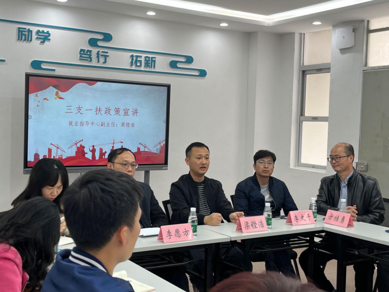 活动第一部分由校就业指导中心副主任梁铿浩对三支一扶政策进行宣讲。他对三支一扶作出介绍,指出广东三支一扶政策的招聘人数呈现上升趋势,并强调三支一扶政策具有工作待遇好,平台广阔的优势。同时,梁铿浩通过我校校友扎根西藏基层的优秀事迹,鼓励同学们积极了解基层就业岗位,在红色职业发展道路上探寻就业新路径,在祖国需要的地方中贡献力量。