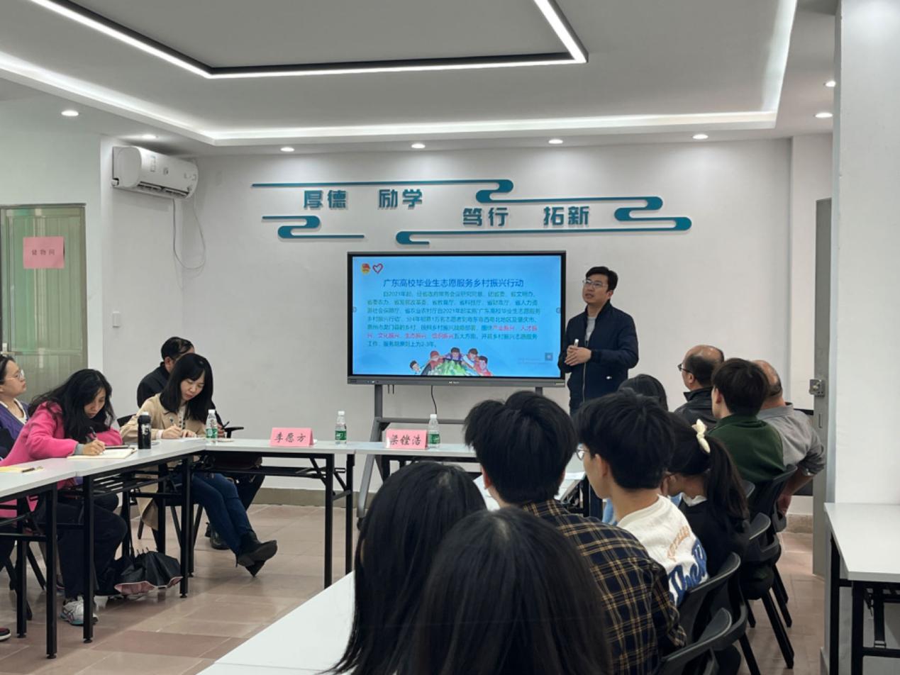 活动第二部分,校团委社会实践与创新创业部副主任李史干向同学们介绍了乡村振兴、西部计划项目政策。他围绕广东大学生志愿服务山区计划,介绍了山区计划的服务岗位、服务内容和计划推进时间表,强调山区计划的面向对象为应届本科毕业生与在读研究生,使现场同学对该计划有了初步的认识。他指出,参与了山区计划的人员在未来就业中可以享受工龄计算、职称评定上优待的政策,对同学们就业具有促进作用,以此鼓励同学们积极参与山区计划。