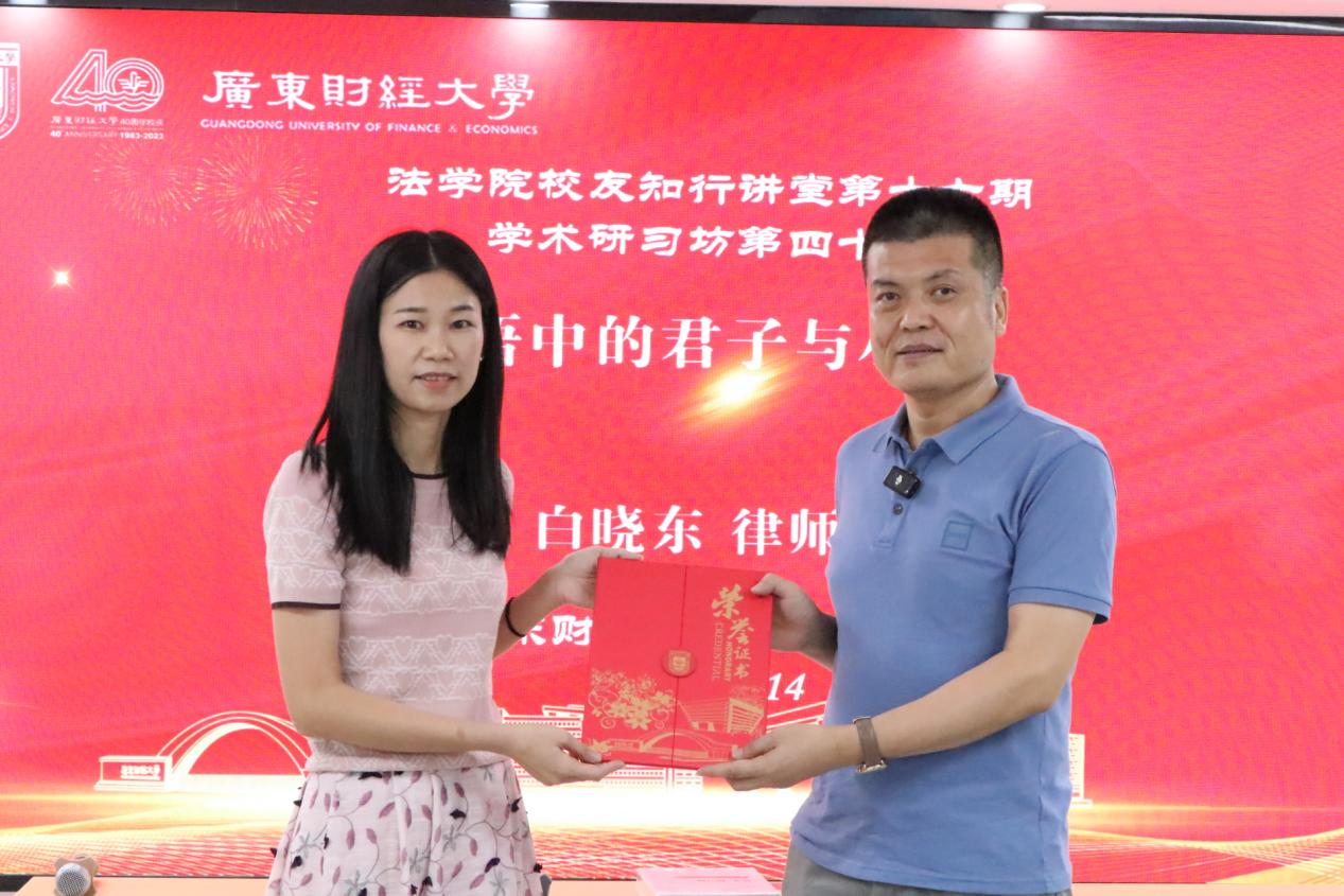 最后,叶李明老师向白晓东律师颁发了荣誉证书,并致以诚挚的感谢。