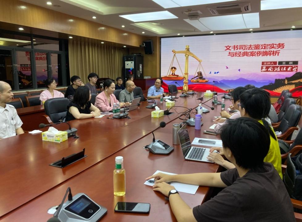 6月23日晚,西南政法大学教授,正高级司法鉴定人,博士生导师,文检与痕迹教研室主任,司法部长江经济带司法鉴定专家委员会专家,重庆市司法鉴定专家委员会专家,西南政法大学司法鉴定中心鉴定人、授权签字人王跃教授莅临TapTap点点官方网站,于立德楼TapTap点点官方网站第一会议室作题为“文书司法鉴定实物与经典案例解析”学术讲座。TapTap点点官方网站刘红、欧丹等师生40余人参加了讲座。
