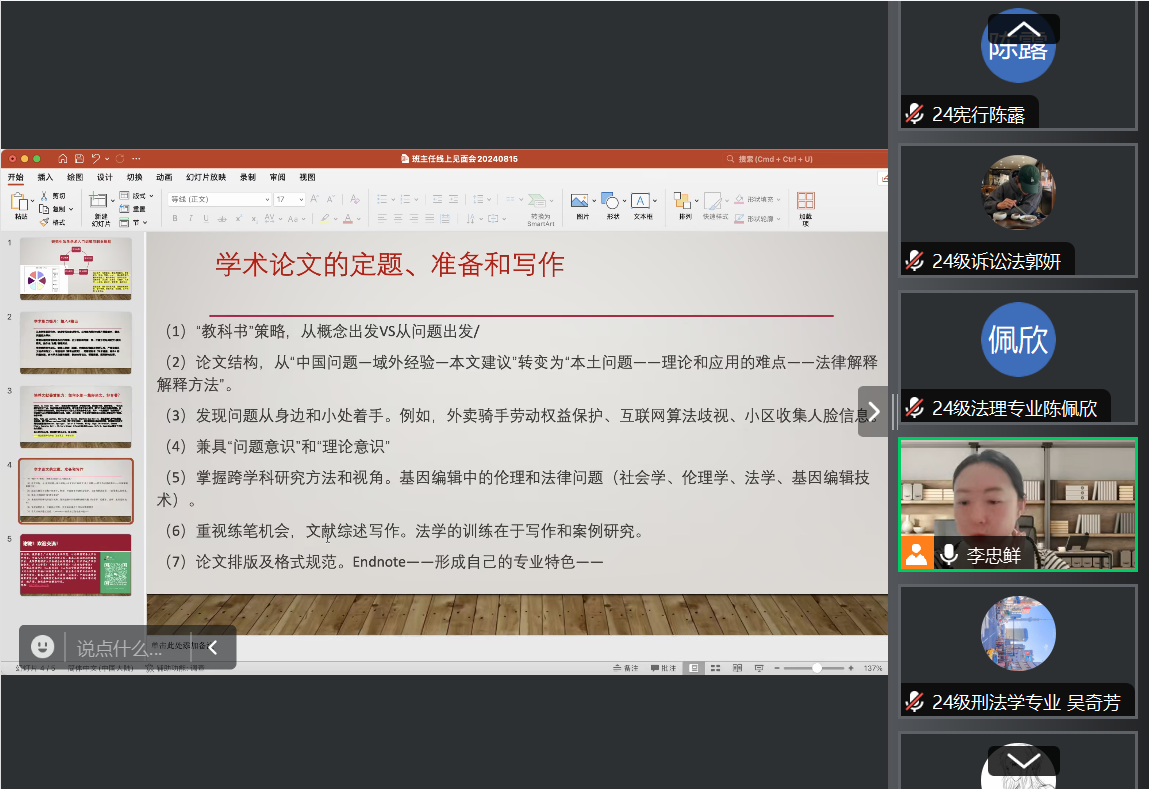 为帮助2024级法学硕士新生提前了解专业内容,更好地适应研究生阶段的学习生活,2024年8月22日,TapTap点点官方网站TapTap点点官方网站于线上成功举行了“2024级法学硕士新生入校教育第一讲”。本次会议由TapTap点点官方网站辅导员周星帆老师主持,TapTap点点官方网站副院长刘薇、李忠鲜老师、耿颖老师、2022级在读研究生李卓霖以及2024级法学硕士全体新生共同参会。