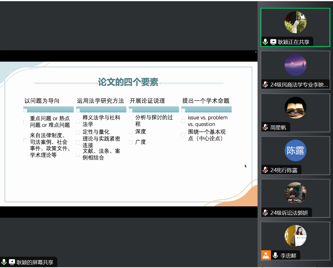 耿颖老师首先讲述了学术论文的四要素,即以问题为导向、运用法学研究方法、开展论证说理、提出一个学术命题。她指出,论文的写作过程是以一个问题为导向,运用综合运用法相应的研究方法开展具体的论证说理,从而最终得出一个学术命题的过程。这要求同学们既要关注法律前沿与热点问题,也要注重理论与实际的联系,在学习中不断强化自己的认识,并上升到理论层次。其次,耿颖也针对检索论文和文献阅读方法进行了经验分享。并以北京大学博士学位论文匿名评阅为例,针对毕业论文的相关注意事项进行了讲解,如引用规范以及查重过程等。最后,她建议同学在广泛阅读的基础上,选择自己喜好的文章,并以此作为模仿对象撰写学术论文,做到先动笔、多动笔、早动笔。
