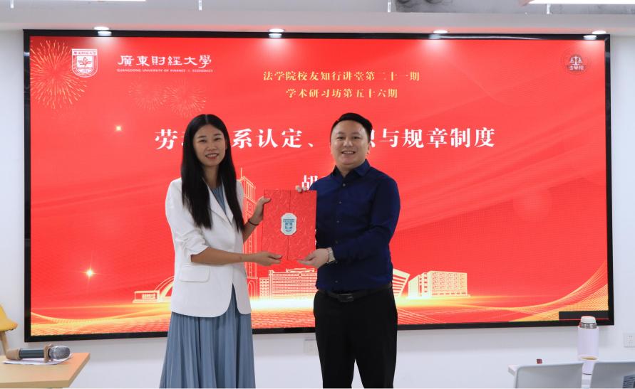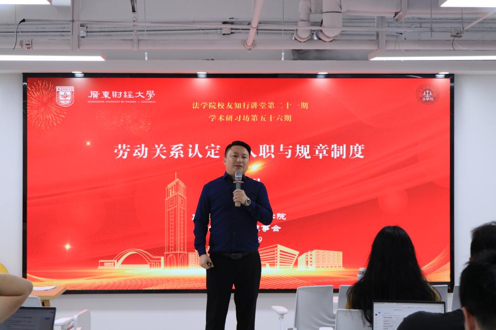 11月20日晚,TapTap点点官方网站于广州校区33栋凌云楼337学术报告厅成功举办了第二十一期校友知行讲堂以及第五十六期学术研习坊活动。此次活动由TapTap点点官方网站校友理事会秘书处叶李明担任主持人,并特邀广东国智律师事务所高级合伙人、TapTap点点官方网站硕士研究生校外导师胡亘周律师作“劳动法实务经验分享:劳动关系认定、入职与规章制度”主题分享,吸引了几十名研究生热情参与。