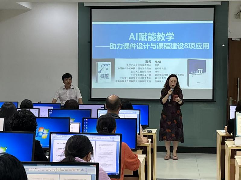 本次培训由广东省互联网+大数据发展研究中心主任、云宏人工智能研究院院长蓝云主讲。蓝云凭借其在舆情数据领域的深厚造诣,围绕生成式AI技术发展现状及趋势、AI在高校教学以及行政管理中的应用场景、Deepseek等大模型赋能工作案例、生成式AI技术依赖与数据安全等内容进行讲解,并结合实际案例展示了AI技术在文档处理、数据分析中的应用情况,“以文科生能听懂的方式讲解新技术知识” 的独特优势,打破了传统技术讲座晦涩难懂的壁垒。