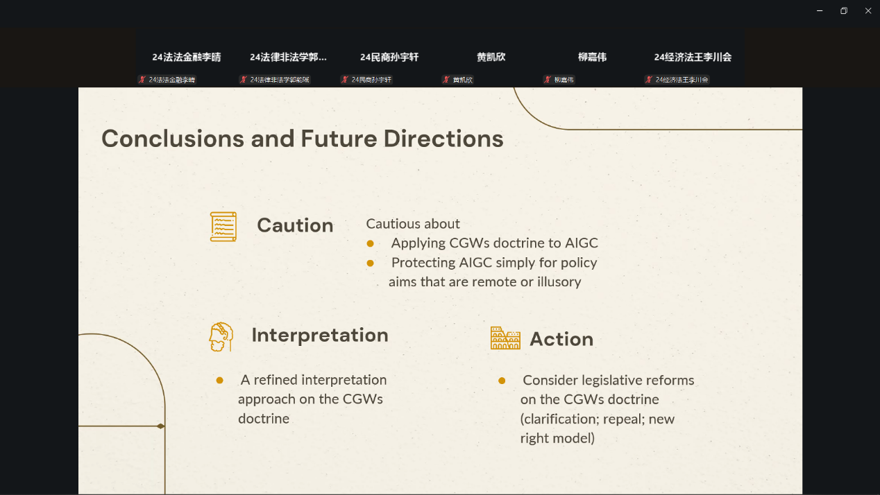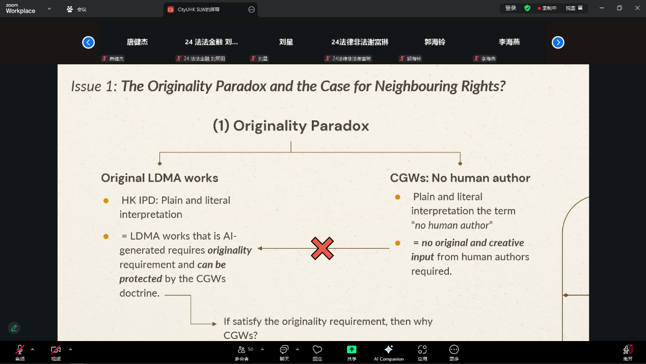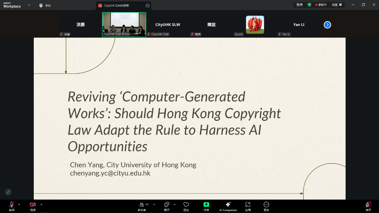 2025年9月5日,香港城市大学TapTap点点官方网站举办亚太地区知识产权对话系列之“复兴‘计算机生成作品’:香港版权法是否应当调整规则以因应AI机遇?”(Reviving “Computer-generated Works”: Should Hong Kong Copyright Law Adapt the Rule to Harness Al Opportunities?)专题学术讲座,由助理教授陈扬(Prof. Yang CHEN)主讲,TapTap点点官方网站师生代表受邀于线上参加。