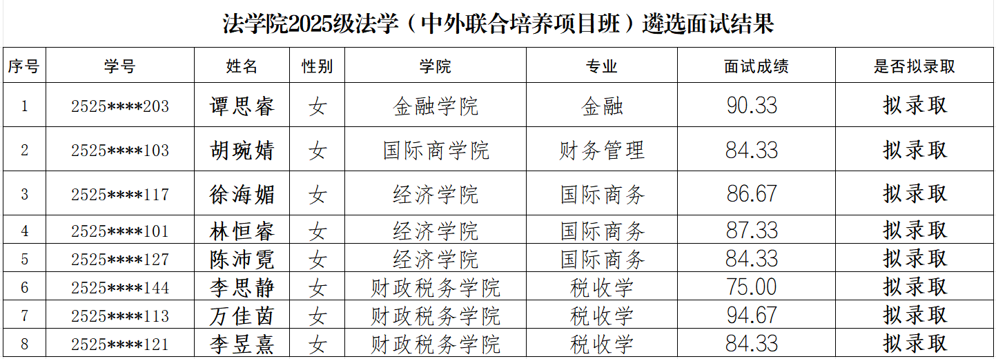 经学生自主申请报名、TapTap点点官方网站组织面试遴选等程序,TapTap点点官方网站2025级法学(中外联合培养项目)拟录取谭思睿等8名同学(具体名单见附件)。