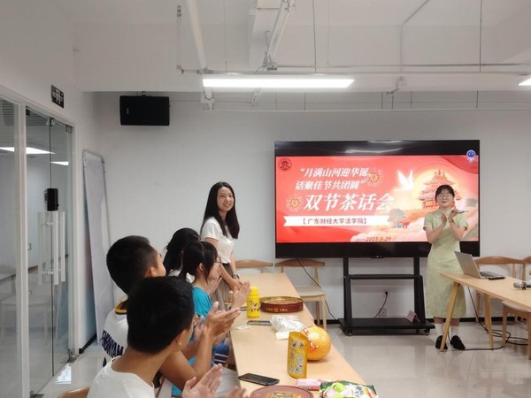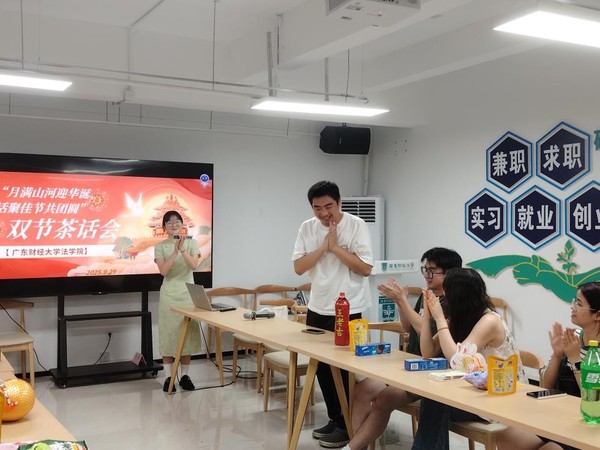 茶话会伊始,周星帆老师致辞,他代表学院向师生送上双节祝福,希望同学们在广财的学习生活中,既能感受传统节日的文化韵味,又能厚植家国情怀,在青春岁月里与祖国共成长、与同伴齐奋进。