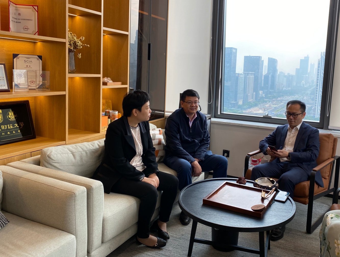 陈静一行走访了校友单位华商侓师事务所深圳总部。在华商侓师事务所,97级校友陈妙财分享了自身的在校学习历程以及工作经历,介绍了事务所的服务理念及职业理念。他讲到:“母校老师们来访,让我深深感受到了作为一名广财法律人独有的归属感,感谢母校老师们的培养,我也会继续做好本职工作,为母校争光,也希望能够在实务与科研方面与学院展开深入地合作,并努力为学弟学妹们提供更多的优质实习、就业机会。”